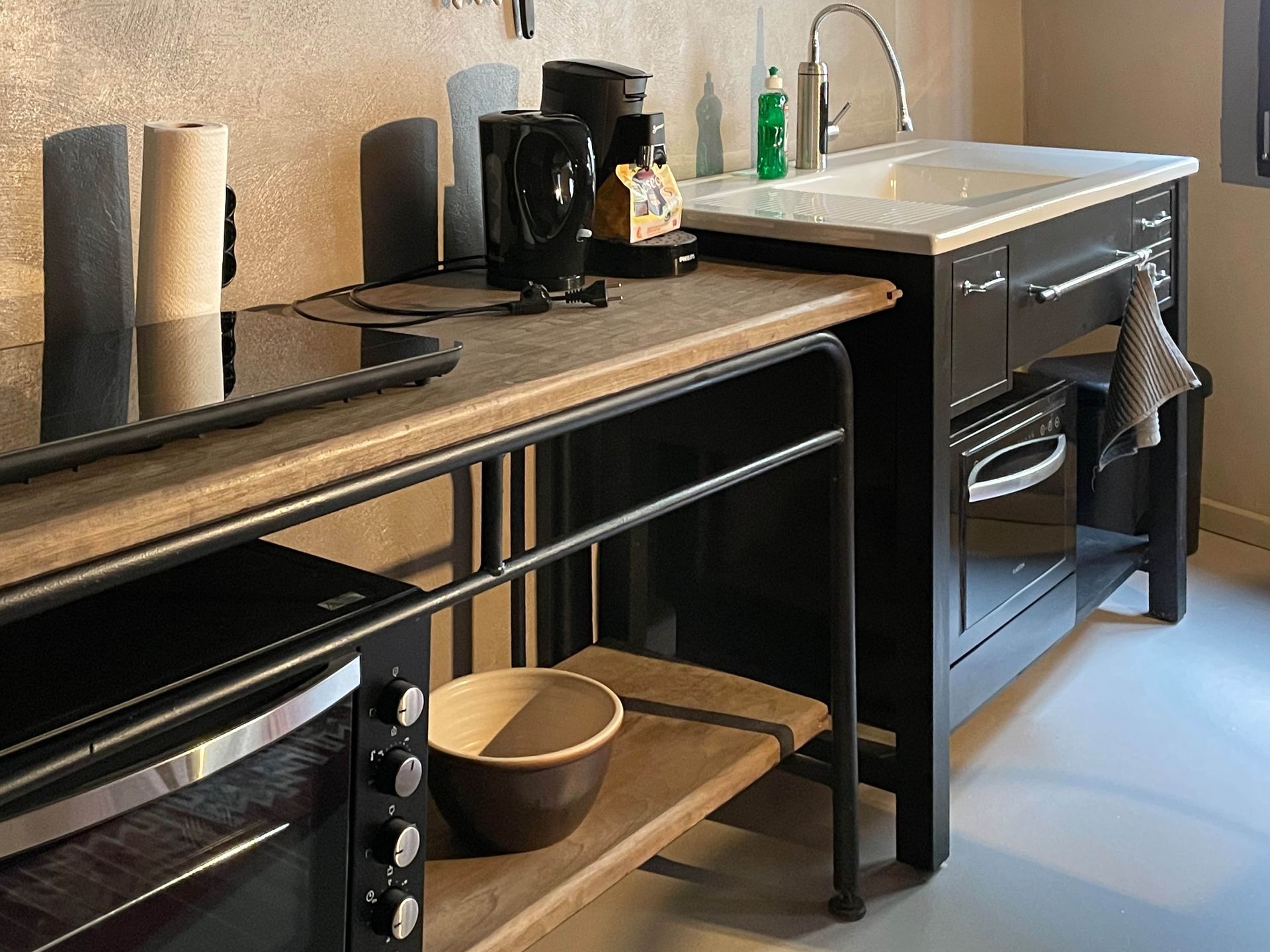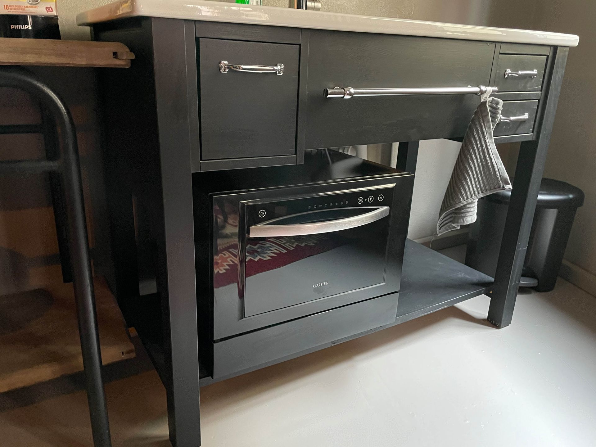 Induktionskochfeld, Backofen, Klein- Geschirrspüler, Kühl-/Gefrierschrank, Toaster, Wasserkocher, Kapselkaffeemaschine, Töpfe, Pfannen, Besteck etc., Geschirrtücher